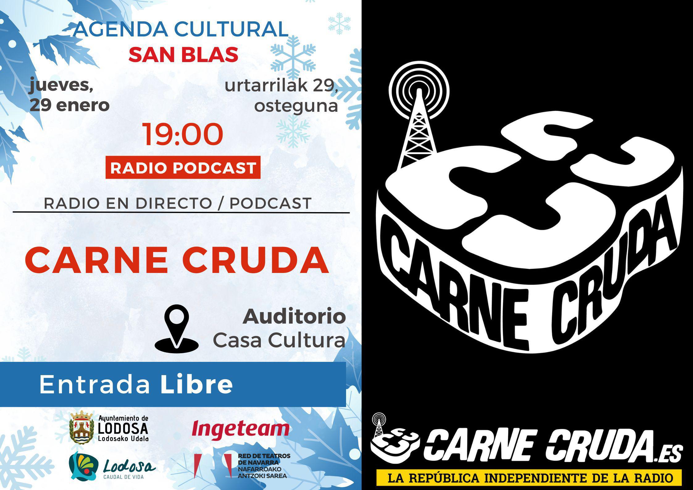 Carne Cruda es un popular podcast y programa de radio español, dirigido por Javier Gallego, conocido por su estilo ácido y crítico que combina política, activismo social, cultura, humor y música, financiado por sus oyentes y emitido en varias radios comunitarias y plataformas digitales.